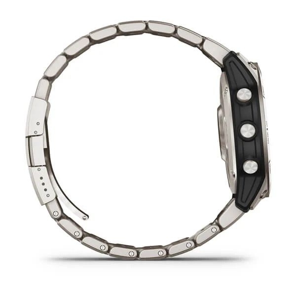 Garmins Titanium-Modell ist ganz im Stil einer klassischen Fliegeruhr gehalten. Das brillante AMOLED-Touchscreen-Display bietet eine optimale Lesbarkeit bei allen Lichtverhältnissen. Die Kombination aus der neuen Touchscreen-Steuerung und der herkömmlichen Bedienung über Druckknöpfe sorgt für ein neues Level in der Interaktion mit einer Smartwatch. Die robuste Uhr ist mit einer Titan-Lünette, einem Titanboden sowie kratzfestem Saphirglas ausgestattet. Die Uhr wird zusätzlich mit einem Silikonband ausgeliefert. Die Armbänder lassen sich ohne Werkzeug austauschen.