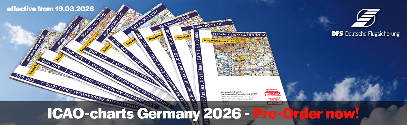 Scale 1:500.000. With detailed flight safety imprint, multicoloured.The chart content includes terrain elevation data and shading, water, forest print, settlement pattern, roads and borders. The air traffic control imprint contains Aerodromes with name, location indicator and frequency, length / direction of the runway, gliding sites, sites for hang gliders and UL, free balloon launch site, free balloon launch sites, parachute landing areas, radio navigation facilities by name, frequency and identification, airspace structure, airspace restrictions, low altitude areas, areas with controlled visual flight, protection zones against military flying low, selected obstacles of aviation, aviation fire Isogonals. Hand margin are legend, ATIS and VOLMET information. Published annually with new FS-print.