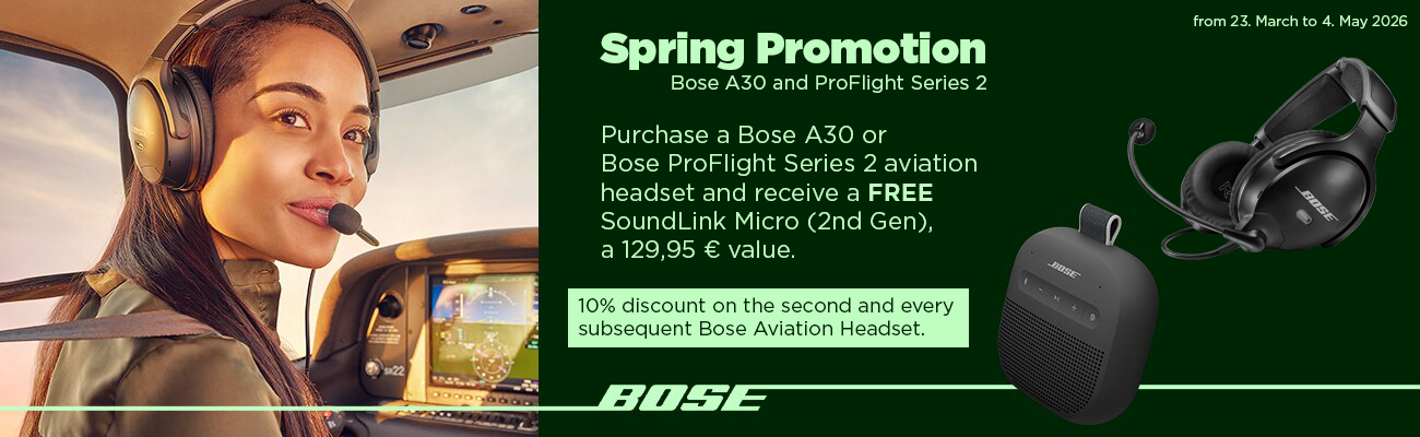 The Bose A30 Aviation Headset is best utilized where noise is pervasive, comfort is required and communication is critical. It’s the most comfortable, full-featured around-ear aviation headset Bose has ever created, and it’s the first-ever around-ear aviation headset with three modes of user selectable active noise cancellation. Each feature of the A30 was inspired by decades of Bose research and development and engineered to perform in high-intensity flight environments. Plus, its lightweight, comfortable design is FAA TSO and EASA E/TSO-C139a certified, proving its durability in tough conditions. Excellent noise reductionPriority switchingPerfect wearing comfortAdjustable microphoneAbout 45 hours of battery lifeCertified to FAA TSO and E/TSO-C139 standards.5-year manufacturer's warrantyMade in the USAScope of delivery: Headset bag, control module holder, 2 cable clips, 2 AA batteries