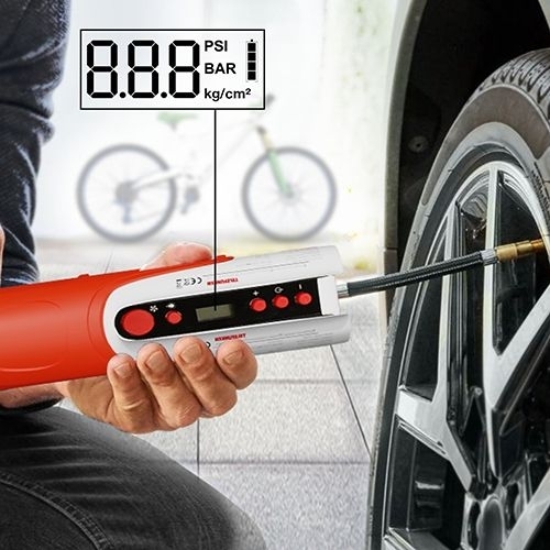 Der leistungsstarke Akku-Kompressor, im handlichen Design, ist immer und überall einsatzbereit. Er verfügt über einen starken Li-Ion Akku in FePO4-Bauweise mit 4 x 500 mAh. Autoreifen, Fahrradreifen oder Freizeitartikel sind für ihn ein Kinderspiel. Dank des Staufachs im Inneren des Gerätes haben Sie den Druckluftschlauch und die 4 Adapter immer griffbereit. Die intergrierte Taschenlampe ermöglicht es Ihnen, auch bei schlechter Sicht mit dem Kompressor zu arbeiten. Über das beleuchtete LC-Display mit Manometer haben Sie zudem die Möglichkeit, den Akkuladezustand sowie den Akkuladevorgang zu kontrollieren. Den Li-Ion-Akku können Sie entweder über das im Lieferumfang enthaltene 12-V-Ladekabel am Zigarettenanzünder Ihres Fahrzeuges aufladen, oder über das ebenfalls enthaltene Netzkabel. Des Weiteren haben Sie die Möglichkeit, den benötigten Luftdruck im Vorfeld einzustellen, da der Kompressor über eine automatische Abschaltvorrichtung verfügt.