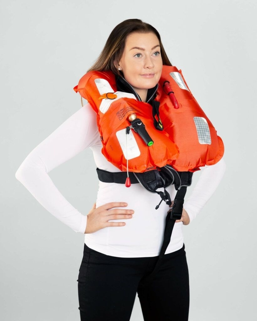 Rettungsweste mit neuem, flach geschnittenen Außenprofil, komfortabel geschnittener Kragen, Luftkammer durch äußere Schutzhülle geschützt, Reißleine zur Aktivierung der CO2-Patrone, separates Mundstück zum manuellen aufblasen der Luftkammer, Signalpfeife, automatisches Notlicht integriert, im aufgeblasenen Zustand mit Bergegurt, stark reflektierenden Markierungen, geeignet für Personen mit einem Gewicht von 40 bis 150 kg, in Schweden nach den neuesten CEN Standards produziert.