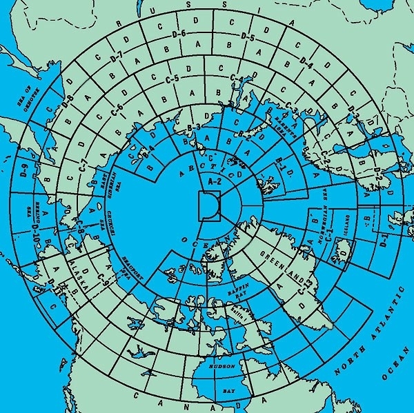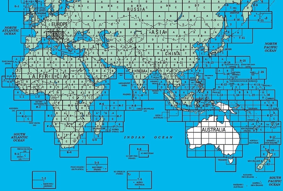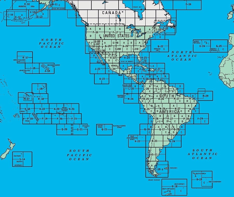 Die Blattbezeichnung erfolgt nach der Bezeichnung der ONC-Karte mit Unterteilung in vier Teilräume wie abgebildetes Schema (siehe Bild 2, Beispiel für die TPC-Karte Blatt F-2 B.)