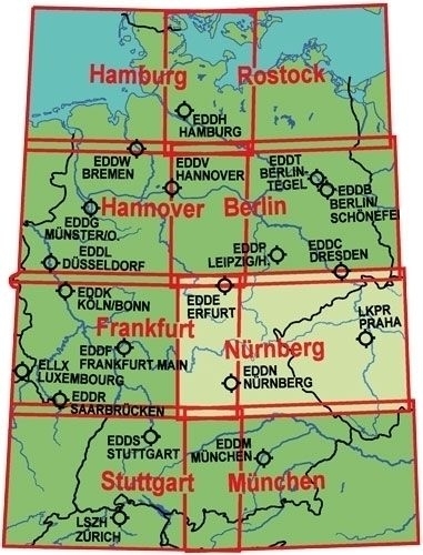 Maßstab 1 : 500.000 Winkeltreue Schnittkegel-Projektion (Lambert), mehrfarbig. Der Karteninhalt umfasst Geländedarstellung mit Höhenangaben und Schummerung, Gewässer, Waldaufdruck, Siedlungsbild, Verkehrswege und Grenzen. Der Flugsicherungsaufdruck enthält Flugplätze mit Namen, Ortskennung und Frequenz, Länge/Ausrichtung der Landebahn, Segelfluggelände, Gelände für Hängegleiter und UL , Freiballonstartgelände, Freiballonstartplätze, Fallschirmabsprunggelände, Funknavigationsanlagen mit Namen, Frequenz und Kennung, Luftraumstruktur, Luftraumbeschränkungen, Tieffluggebiete, Gebiete mit kontrolliertem Sichtflug, Schutzzonen gegenüber militärischem Tiefflug, ausgewählte Luftfahrthindernisse, Luftfahrtfeuer, Isogonen. Am Kartenrand befinden sich Legende, ATIS-, und VOLMET-Informationen. Erscheinungsweise jährlich mit neuem FS-Aufdruck.