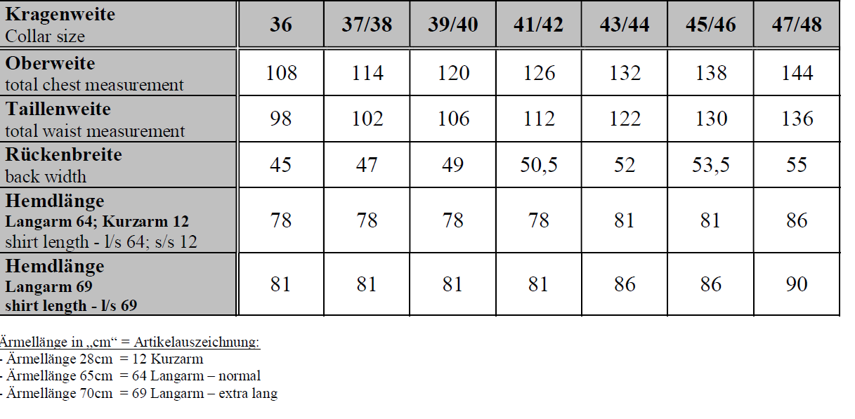 Kragenweiten (in cm): 36, 37, 38, 39, 40, 41, 42, 43, 44, 45, 46, 47, 48