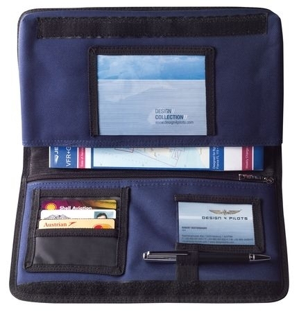 Große Dokumententasche aus gepolstertem Nylon. Innen zwei Einschubfächer, eine Innentasche mit Reißverschluß, Visitenkartenfach, zwei Bleistifthalter. Für Bordbuch, Flugbuch und sonstige Dokumente.