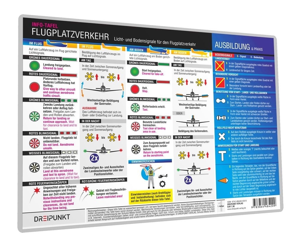 Diese Info-Tafel richtet sich an angehende Piloten und alle Luftfahrt-Interessierten, die wissen möchten, welche Informationen mit dem Einwinken und den Lichtsignalen übermittelt werden.