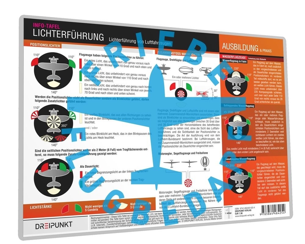 Diese nicht nur für angehende Piloten interessante Info-Tafel zeigt die Lichterführung der verschiedensten Luftfahrzeuge auf einen Blick in informativen, klaren Darstellungen.