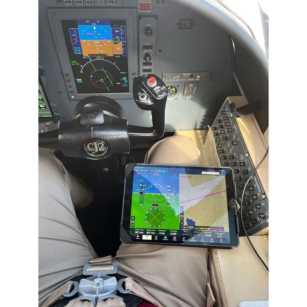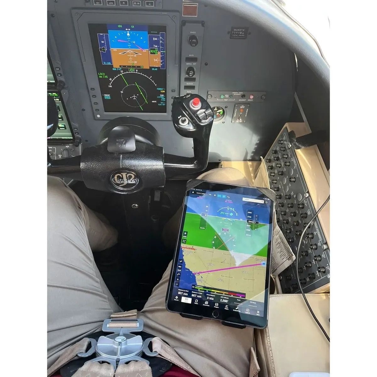 Die kleinste, einfachste Lösung für die Verwendung eines iPads im Cockpit. Keine Spielereien, nur eine einfache Halterung, die ein iPad hält. Elastische Bänder sind beweglich, um das Drücken von Tasten auf Ihrem Tablet zu vermeiden. Ein integrierter Drehmechanismus ermöglicht die Ausrichtung im Hoch- und Querformat. Eine robuste Kante dient als gute Stütze für Ihr Gerät. Ein geteiltes Basisdesign erhöht die Stabilität und hält den Stromanschluss zugänglich. Funktioniert sogar mit den meisten Hüllen.