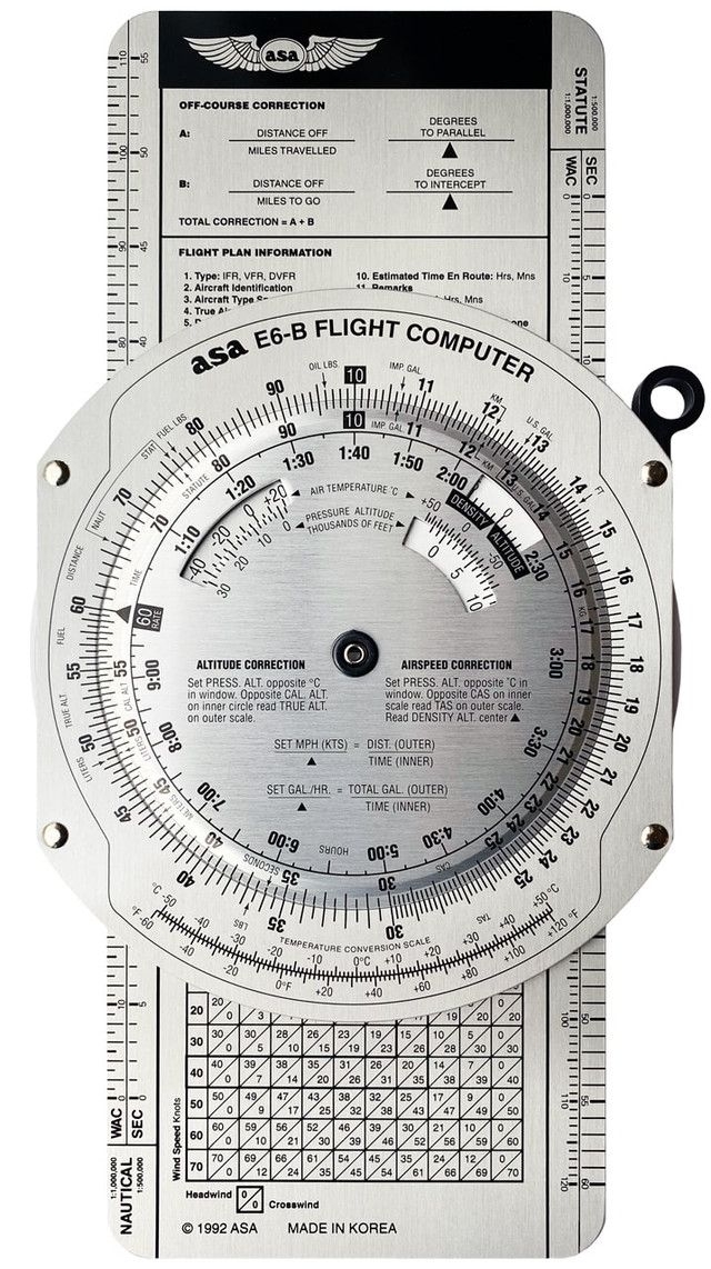 Auf der Vorderseite sind Zeit, Geschwindigkeit und Distanz, sowie Treibstoffverbrauch, Luft-Dichthöhe und alle anderen umgänglichen Berechnungen möglich.