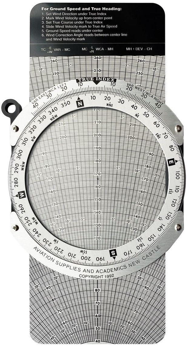 Mit der Rückseite ist es möglich Steuerkurs, Bodengeschwindigkeit, Wind -korrektur, Gegen- und Seitenwindkomponenten mit dem Winddreieck abzulesen.