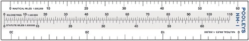 Praktische Länge (240 mm x 38 mm) für den Gebrauch im Cockpit. Die Außenkanten zeigen jeweils 0–60 nm in 1:500.000 und 0–30 nm in 1:250.000 an. Die mittlere Skala rechnet zwischen Kilometern (km) von 0–110 km in 1:500.000 und Landmeilen (sm) von 0–70 sm in 1:500.000 um.