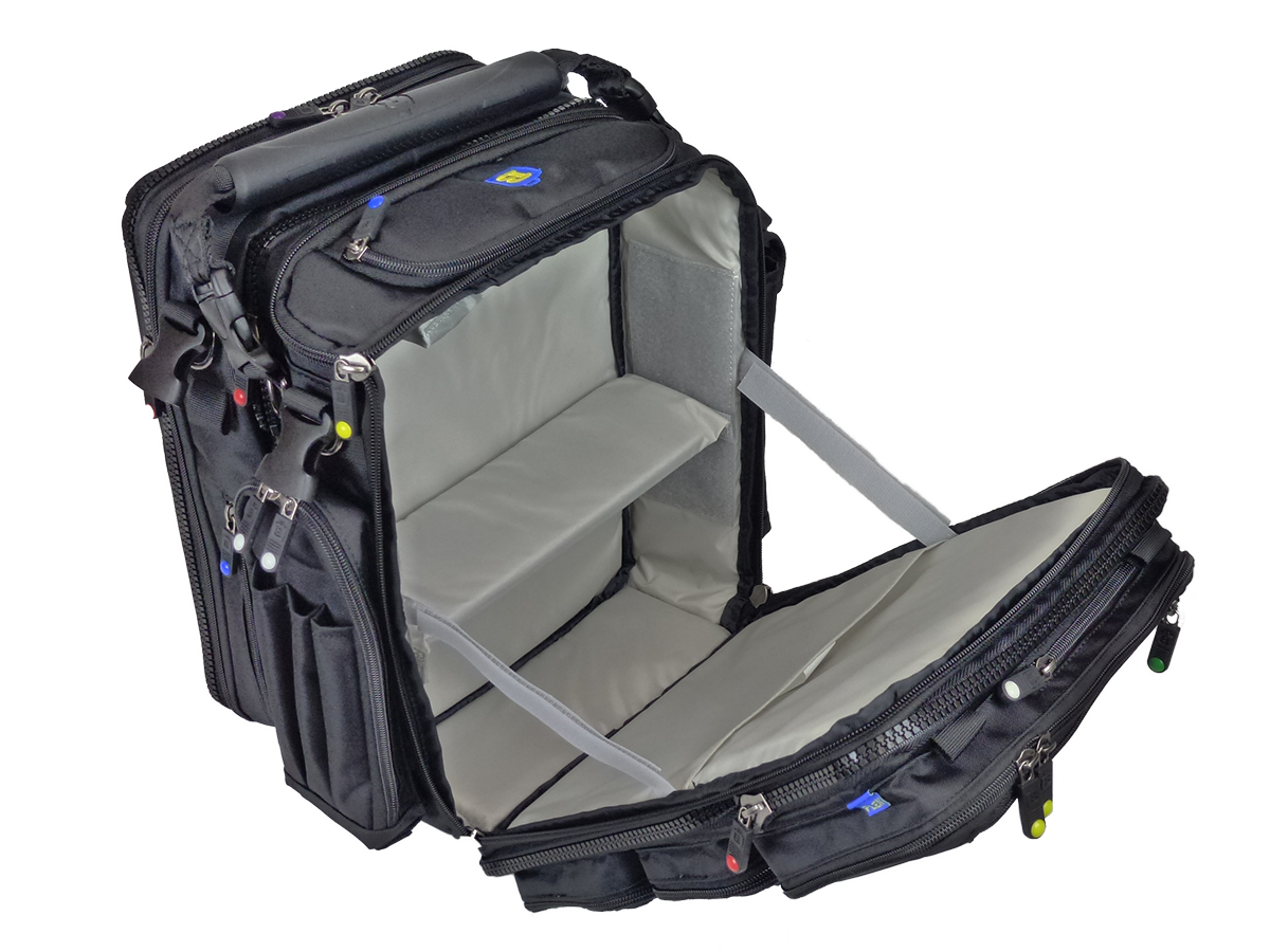 Ideale Pilotentasche mit Platz für zwei Headsets, einem Tablet, einem Notebook, einem Funkgerät, technischen Zubehör wie Akkus und Kabel, einer Vielzahl von Luftfahrtkarten, Sonnebrille (inkl. Etui) und persönliche Dinge