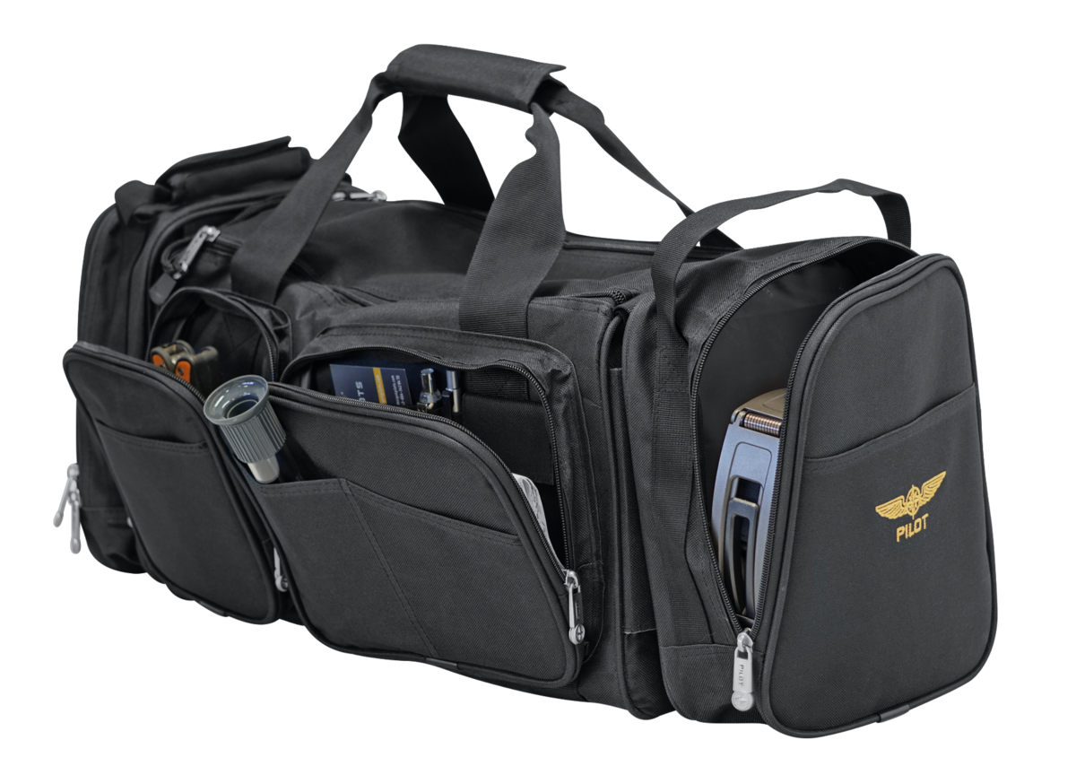 Eine Pilotentasche, die speziell für Piloten und deren Ansprüche gefertigt wird, überzeugen Sie sich selbst von der Vielfältigkeit dieser Tasche. Die Tasche besteht aus strapazierfähigem Nylon und ist zusätzlich rundum gepolstert. Auf der Vorderseite eine aufklappbare Tasche mit diversen Einsteckmöglichkeiten. Daneben befindet sich eine Tasche für ein Funkgerät, GPS, etc. mit getrennten Reißverschlüssen (Antenne am Gerät muß nicht abgemacht werden). Beide Taschen mit Außenfächern. Auf beiden Stirnseiten abnehmbare Taschen für Headsets, die auch zu einer Doppeltasche verbunden werden können. Die rechte Stirntasche läßt sich auch als praktischer Kleinrucksack verwenden. Auf der Rückseite befindet sich eine Wäschetasche, die ebenfalls abnehmbar ist. Das geräumige Innenteil läßt sich variabel einteilen und bietet stabilen Halt. Das Hauptfach ist absperrbar. Mit Schulterriem, Schulterriemenhalterungen aus Metall. Ohne Inhalt.