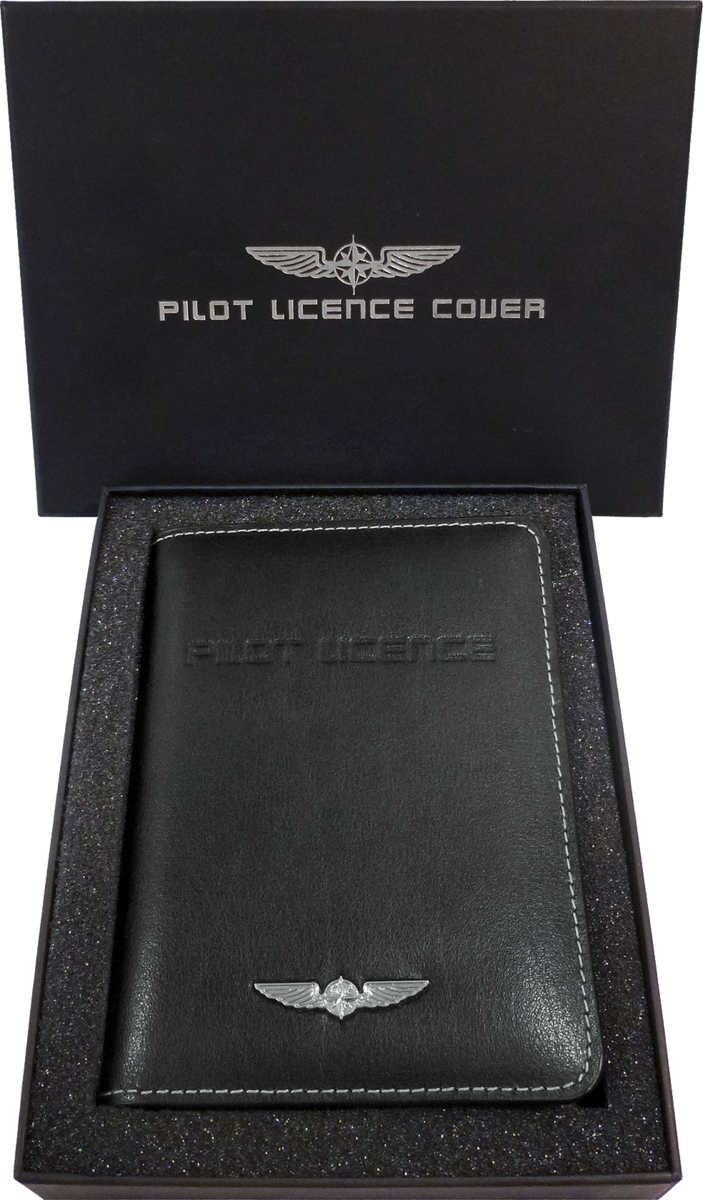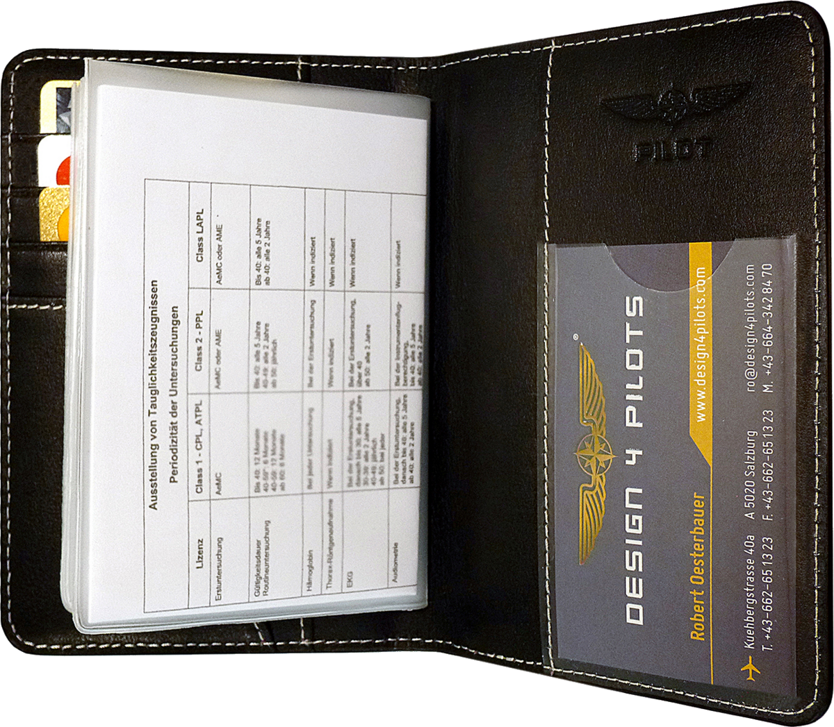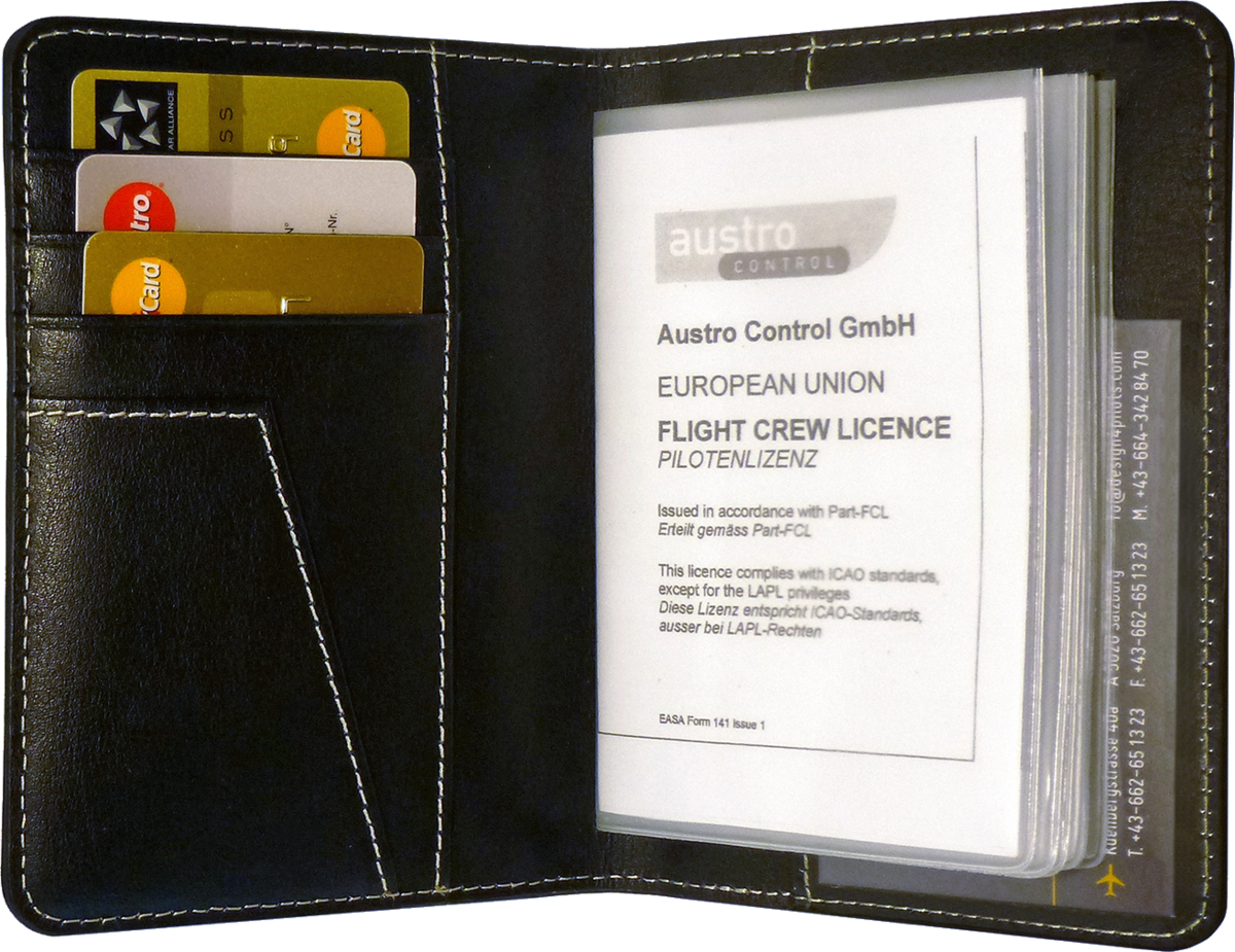 Diese elegante und formschöne Lizenzmappe aus umweltfreundlich hergestelltem Leder ist hochwertig verarbeitet. Sie bietet sechs Hüllen für Pilotenlizenz, Visitenkarte etc. und fünf Kreditkartenfächer. Außenseite mit silberfarbener Metallschwinge.