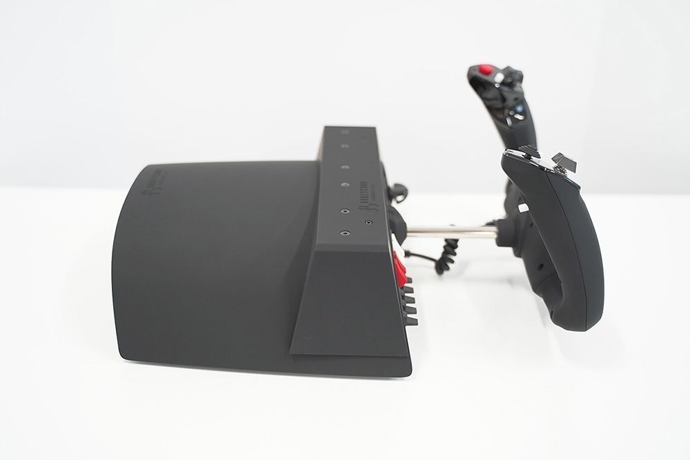 Am linken Griff befinden sich zwei Tasten, zwei 2-Wege-Hat-Switches und eine Push-to-Talk-Taste, während der rechte Griff über zwei weitere 2-Wege Hat-Switches, einen 8-Wege-Rundblickschalter sowie eine Taste verfügt.