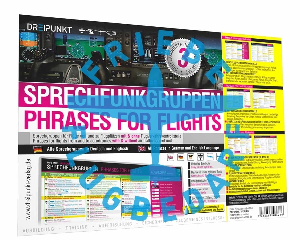 Sprechgruppen für Flüge von und zu Flugplätzen mit und ohne Flugverkehrskontrolle (3-Tafel-Set) Deutsch & Englisch.
